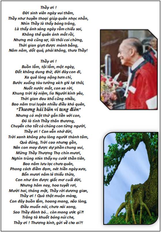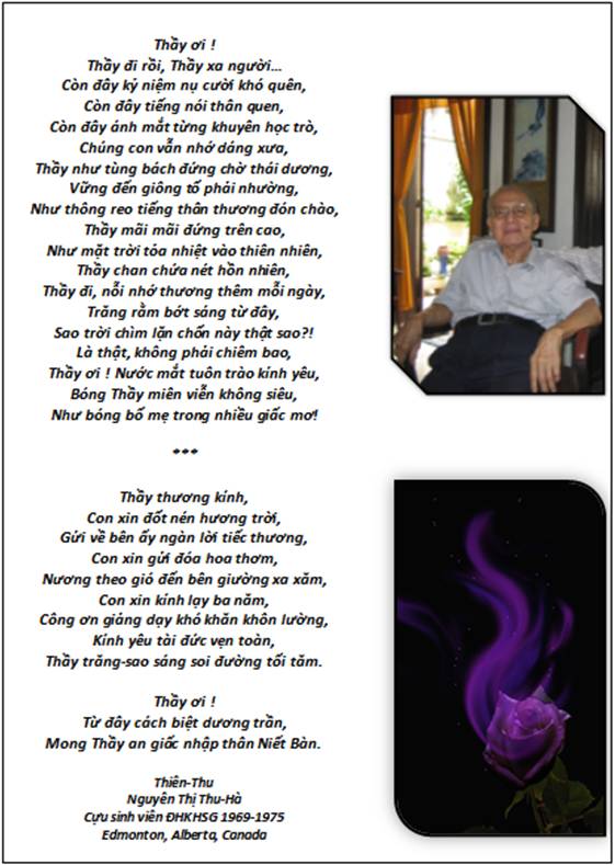 Và hôm nay, 12-01-2014, GS đã đã ra đi, trong niềm kính yêu và tiếc thương vô vàn chẳng những của gia đình mà còn của nhiều cựu sinh viên và đồng sự nơi quê nhà cũng như ở hải ngoại.