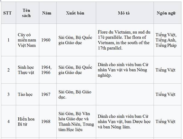 Trong cuộc đời nghiên cứu khoa học của mình, ông là tác giả của nhiều sách về thực vật học Việt Nam như Rong Biển Việt Nam (1969), Tảo học (1972), Sinh học thực vật (tái bản lần thứ tư,1973), Hiển hoa Bí tử (tái bản lần thứ nhì,1975) và Cây cỏ miền Nam Việt Nam (An illustrated flora of South Vietnam: Nấm, khuyết thực vật và song tử diệp cánh rời và vô cánh; Quyển 1, 1972) và nhiều bài nghiên cứu có giá trị khác.