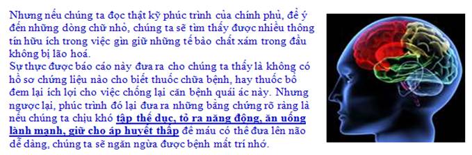 Tuy nhiên, trong thực tế, những điều kiện đó dễ bị xâm hại do tác động của nhiều yếu tố, khiến chúng ta sa sút trí tuệ, mất trí nhớ, bị bệnh Alzheimer, Parkinson…