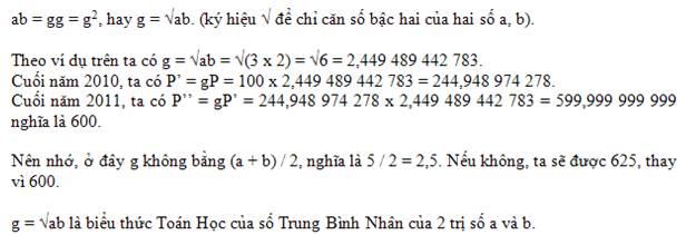 Cho một số P (cho P = 100) ở đầu năm 2010, cuối năm 2010 (hay đầu năm 2011), ta có gấp a (cho a = 3) lần (nghĩa là 3P hay aP hay 300), và cuối năm 2011, ta lại có gấp b (cho b = 2) lần số của đầu năm 2011 (nghĩa là 3P x 2 = 6P hay abP hay 600). Gọi g là Trung Bình của a và b (trong thí dụ nầy a = 3 và b = 2), thay g vào trị số a và b, ta có :