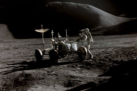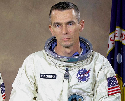 Cernan từng bay vào vũ trụ ba lần và bay tới mặt trăng hai lần. Trong lần đầu bay tới mặt trăng vào năm 1969 cùng tàu Apollo 10, vào tháng 5/1969 ông cùng hai đồng nghiệp không đáp xuống mặt trăng. Chuyến bay này được thực hiện để chuẩn bị cho cuộc đổ bộ của tàu Apollo 11. Tới tháng 12/1972, ông trở lại mặt trăng với vai trò chỉ huy tàu Apollo 17. Ảnh: NASA.