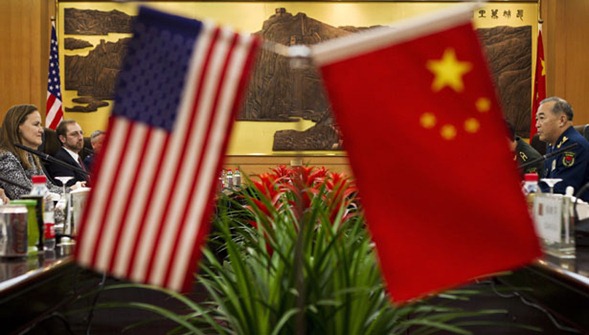 Cờ của Trung Quốc và Mỹ trong cuộc gặp ngoại giao tại Bắc Kinh (Reuter)