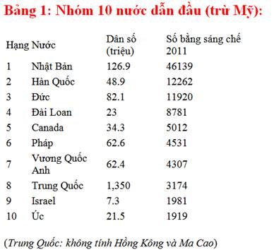Để bảo đảm tính “khách quan”, người viết không thống kê số bằng sáng chế Mỹ của chính nước Mỹ. Bài viết chỉ đề cập số bằng sáng chế Mỹ trong năm 2011, và được trích lục từ Văn phòng thương hiệu và bằng sáng chế Mỹ (USPTO). Dữ liệu về dân số và thu nhập được lấy từ BBC.