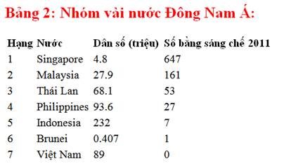 Trong khu vực Đông Nam Á, đất nước nhỏ bé Singapore với 4.8 triệu dân có 647 bằng sáng chế (một đất nước xa xôi ở Bắc Âu với dân số tương đương, Phần Lan với 5.3 triệu dân cũng có 951 bằng sáng chế). Đứng thứ hai là Malaysia với 161 bằng sáng chế. Trong khi đó, Việt Nam không có bằng sáng chế nào đăng kí ở Mỹ trong năm 2011.