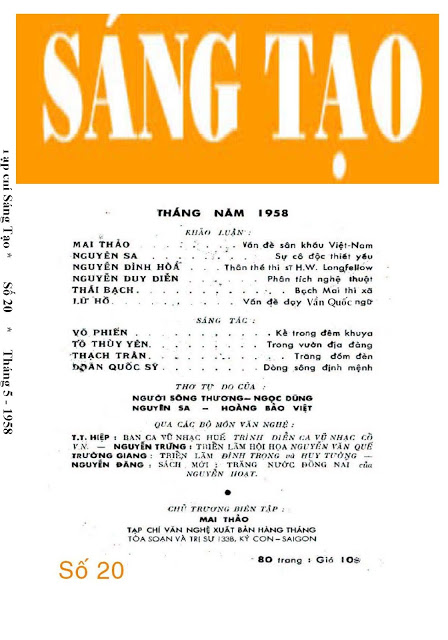 Trên tạp chí Sáng Tạo, ngoài những tên tuổi kể trên người ta còn thấy Nguyên Sa, Cung Trầm Tưởng, Bùi Giáng, Tô Thùy Yên, Dương Nghiễm Mậu, họa sĩ Thái Tuấn. Sáng Tạo số đầu ra tháng 10/1956 và tạm ngưng ở số 27 (tháng 12/58). Sáng Tạo bộ mới chỉ đến số 7 (tháng 3/6