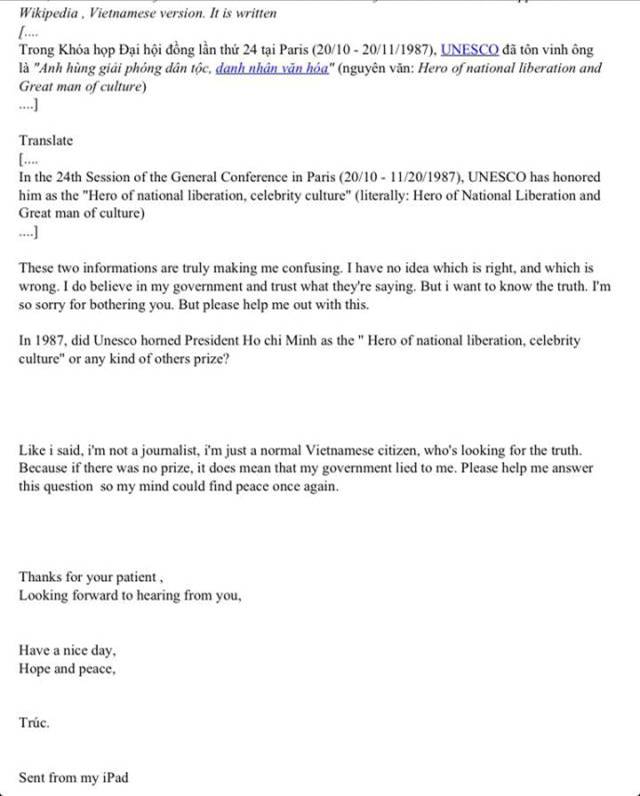 Cháu tìm được số điện thoại và liên lạc với tổ chức Unesco. Tim cháu đứng nhịp khi đầu dây bên kia nghe máy chỉ sau một hồi chuông. Một giọng phụ nữ trẻ trả lời bằng tiếng Pháp, tiếng Pháp của cháu không giỏi, nên hỏi xem chị nói được tiếng Anh không, chị trả lời có. Cháu trình bày về thông tin mình tìm được về Bác trên wikipedia quốc tế, và những điều mình được học, được biết. Cháu hỏi chị này mình có thể liên hệ với ai để xác nhận. Chị hẹn cháu khoảng nửa tiếng gọi lại xem sao.