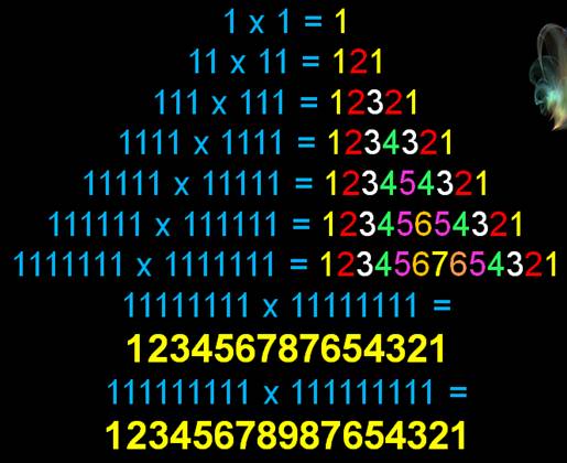 “Tích số của 2 số bằng nhau hợp bởi N con số 1 là một số gồm 2N – 1 con số hợp bởi 3 số ráp nối liền nhau: (i) số đầu gồm các con số từ 1 đến N-1 theo thứ tự đó; (ii) số giữa là N; (iii) số cuối gồm các con số từ N-1 đến 1 theo thứ tự đó”