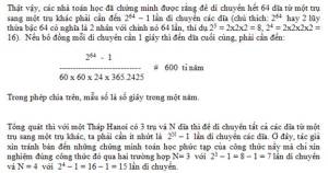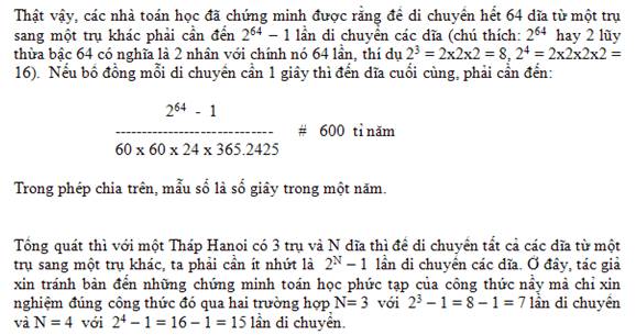 Rất mong bài viết nầy đem lại cho độc giả vài phút thư giản và nếu có thời giờ, độc giả thử áp dụng phương pháp kiểm nghiệm trên vào trường hợp trò chơi Tháp Hanoi với 3 trụ và 5 dĩa (31 lần di chuyển) hay 6 dĩa (63 lần di chuyển).