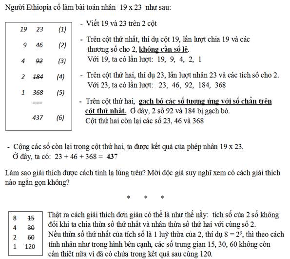 Ngàn năm về trước, người Ethiopia có cách làm toán nhân rất lạ lùng như dưới đây, khác với phương cách ngày nay. Thí dụ: ngày nay, ta nhân 19 với 23 như sau: