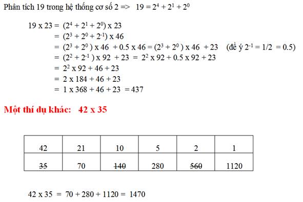 Còn tại sao các số 23, 46 và 368 ứng với các số lẻ 19, 9 và 1 trong cột 1 lại là thành phần phải tính của tích số? Thật ra các số đó gây ra từ phần lẻ của các số trong cột 1, thí dụ 9 thay vì phải 9.5.