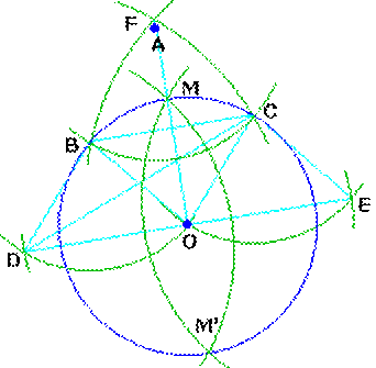 Vẽ vòng tròn (D,OF) và vòng tròn (E,OF). Hai vòng tròn nầy cắt nhau tại 2 điểm M và M’.