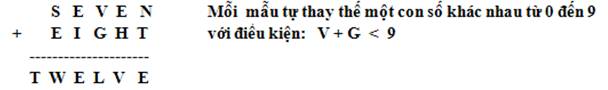 Giải những bài toán với số thay bằng mẫu tự mà không dùng đền những chương trình điện toán thường thường không phải dễ dàng. Lúc trước, Thuận Hoà đã đã cùng độc giả giải bài toán “SEND + MORE = MONEY” (xem Chuyện Phiếm Khoa Học CP028).