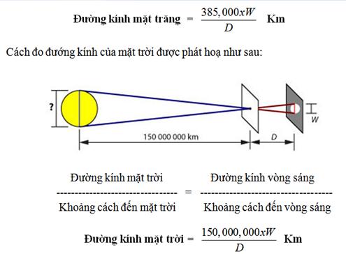 Đo đường kính của mặt trời thì phiền phức hơn vì bạn không thể nhìn thẳng mặt trời bằng mắt trần, thay vào đó, bạn dùng ảnh của mặt trời. Cách đo như sau: