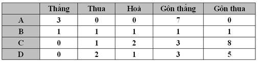 e) Đội A thắng đội D. Số gôn thua của đội D bằng 1. Số gôn thua của đội A bằng 0.