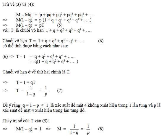 Vì ta phải tiếp tục tung hột xúc xắc hoài hoài cho đến khi nào có mặt 4 hiện ra mới ngừng, nên trung bình M của các lần tung bằng, theo (1):