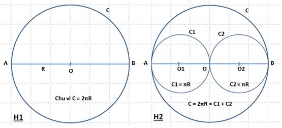 Chu vi của 2 vòng tròn C1 và C2 bằng: C1 = C2 = 2π(R/2) = πR