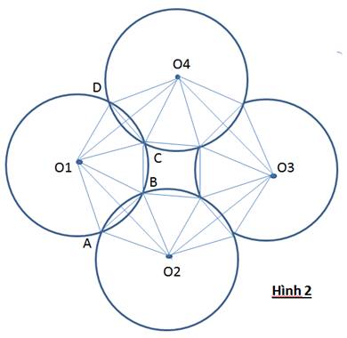 Gọi O1, O2, O3 và O4 là tâm của 4 vòng tròn Và A, B, C và D là 4 giao điểm trên vòng tròn tâm O1 (Xem Hình 2)