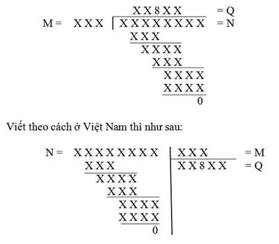 XXXXXXXX là số phải chia N, XXX là số chia M và XX8XX là thương số Q.