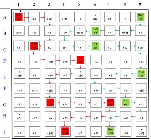 Bài toán 2: Giải bài tính với ô bắt đầu là A9 (START 40) và ô cuối cùng là I7 (STOP 50)