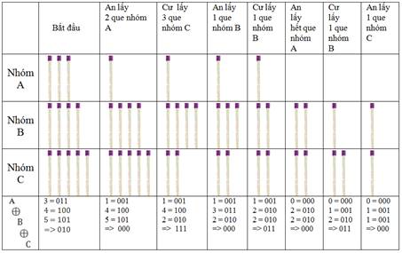 Trong thí dụ 1, với 3 nhóm A, B, C gồm 3, 4 và 5 que, An đi đầu đúng như quy tắc lấy que để thắng như sau: