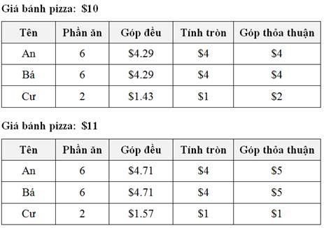 Ba người bạn An, Bá và Cư rủ nhau đi ăn pizza. Kiểm lại túi thì không ai có bạc lẻ đến tiền xu (5, 10, 20 và 50 xu), chỉ có các đồng $1 và $2. Họ gọi một bánh pizza lớn và đồng ý với nhau là, để cho sòng phẳng, mỗi người sẽ góp tiền theo phần ăn của mình. Vì không ai có tiền xu lẻ, nên 3 người bạn nghĩ ra một giải pháp đặc biệt như sau: