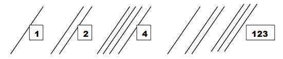 b) Một số gồm n con số được biểu diễn bằng n nhóm đường thẳng song song, mỗi nhóm biểu diễn 1 con số. Một số gồm 3 con số được biểu diễn bằng 3 nhóm đường thẳng song song, từ trái qua phải: nhóm 1 biểu diễn con số hàng trăm, nhóm 2 biểu diễn con số hàng chục, nhóm 3 biểu diễn con số hàng đơn vị. Thí dụ: