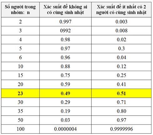 Từ xác suất để n người trong nhóm không có cùng sinh nhật, suy ra dễ dàng xác suất để n người trong nhóm có ít nhất 2 người có cùng sinh nhật theo bảng dưới đây: