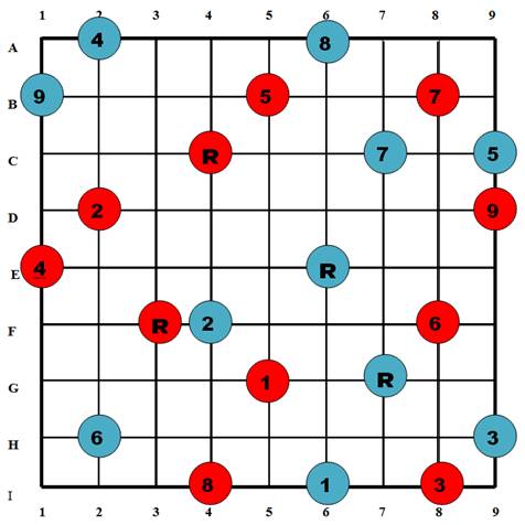 R: Red Root at F3 moves to F2 and removes Blue 4 at A2 và Blue 6 at H2