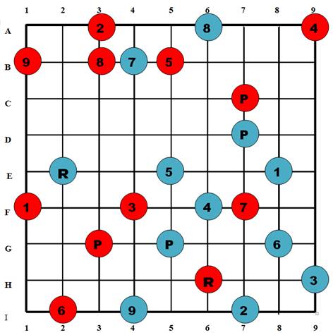 R: Red Power at C7 moves to C4 and removes Blue 7 at B4 and Blue 9 at I4.