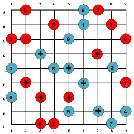 Chess Pieces: 4 Additions, Digits (0 … 9), Blue goes first.