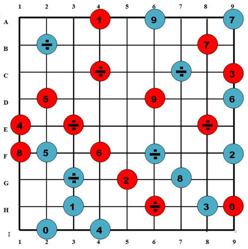 Chess Pieces: 4 Divisions, Digits (0 … 9), Blue goes first.