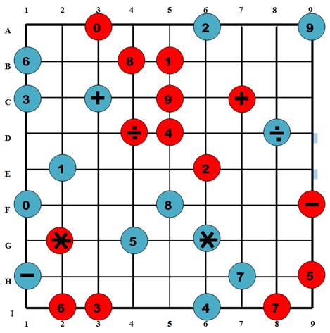 B: Blue 2 at A9 jumps over its partner Blue 9 at C9 and removes the Red Subtraction at F9. (Digit Pair)