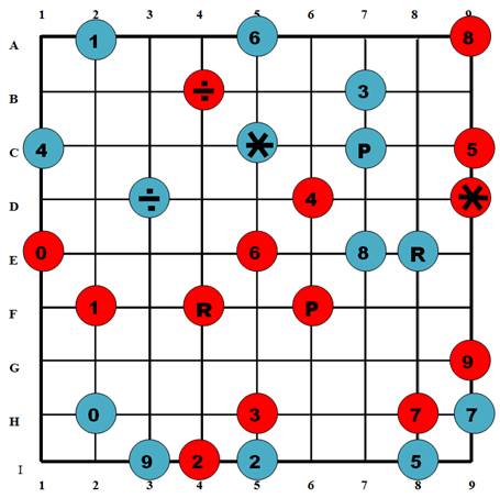 R: Red 8 at A9 jumps over its partner Red 5 at C9 and removes Blue Division at D9.