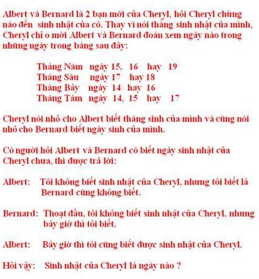 Alex Bellos đã phổ biến một bài toán lý luận đã làm xôn xao giới ham thích Toán học ờ Singapore. Đó là bài toán về “Sinh nhật của Cheryl”. Bài toán đã thu hút nhanh chóng hơn năm triệu lượt xem và đơn giản như dưới đây:
