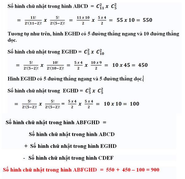Hình ABCD tạo bởi 11 đường thẳng ngang và 5 đường thẳng dọc. Mỗi cặp đường thẳng ngang và cặp đường thẳng dọc tạo thành 1 hình chữ nhật, Hình ABCD có C(11,2) cặp đường thẳng ngang và C(5,2) cặp đường thẳng dọc. Chú thích: C(11,2) là tập hợp của 11 vật chập 2, C(5,2) là tập hợp của 5 vật chập 2. Như vậy, xem lời giải bài T018,