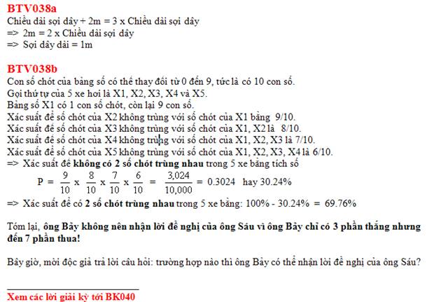 BTV039b – Một tội nhân bị án tử hình. Hình phạt có thể là treo cổ hay ngồi ghế điện và đã được định trước mà tội nhân không được biết. Trước khi thọ án, tội nhân được đặc ân cho phát biểu một câu. Nếu câu đó sai, tội nhân sẽ bị treo cổ. Nếu câu đó đúng, tội nhân sẽ bị ngồi ghế điện. Hỏi vậy: tội nhân phải phát biểu thế nào để thoát án tử hình?