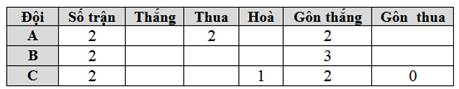BTV090b – Ba đội bóng A, B và C cùng tranh giải theo thể thức vòng tròn. Mỗi đội đá 2 trận. Bác Chín được người ta cho biết kết quả như sau: