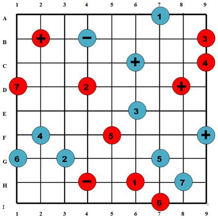 Chess Pieces: 2 Additions + 1 Subtraction, Digit 1 … 7, Bhue side goes first.
