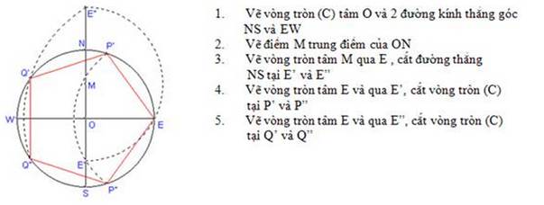 Cách vẽ một ngũ giác đều (5 cạnh) nội tiếp trong vòng tròn có thể thực hiện bằng phương pháp Richmond như sau: