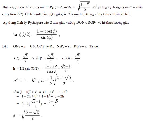 Tóm lại, P1P2 = s là cạnh của một ngũ giác đều nội tiếp trong vòng tròn có bán kính bằng 1.