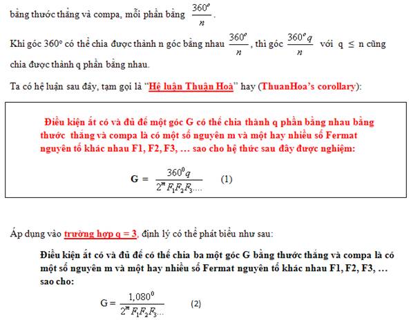 Với ThuanHoa’s corollary, từ đây người ta không còn phải mất thì giờ tìm xem khi nào thì một góc cho sẵn có thể chia thành nhiều phần bằng nhau bằng cách chỉ dùng thước thẳng và compa.