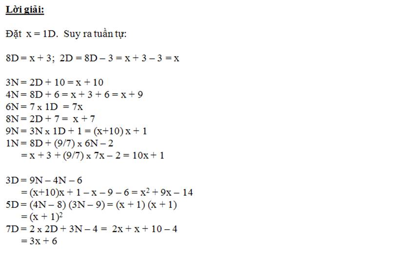 Thí dụ: 1N = 7D + 10, 2N = 8N + 3 x 4D, vv…