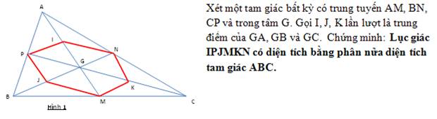 Chúng ta sẽ giải bài toán tìm cách vẽ một lục giác đều có diện tích cho sẵn qua một bài toán áp dụng tính chất của trung tuyến và trong tâm trong tam giác. Bài toán như sau: