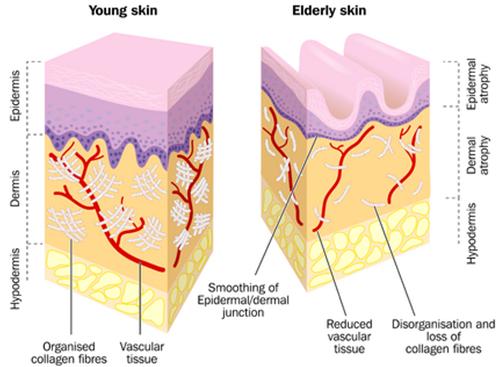 Chúng ta đã giảm dần việc sản xuất chất keo dính của da từ giữa tuổi 20. Việc thay thế các tế bào chết cũng chậm dần.