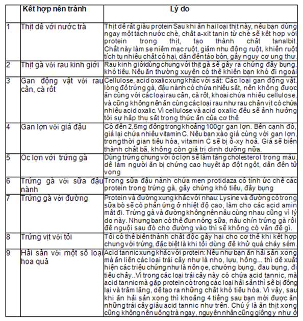 Dưới đây là một số những kết hợp thực phẩm cần phải tránh :