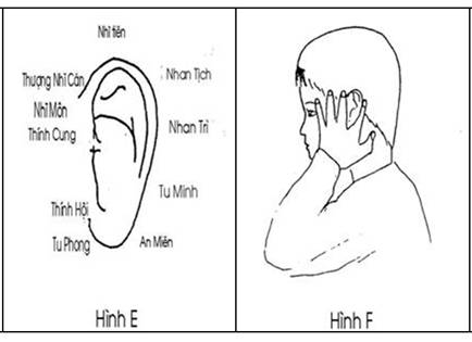 Chung quanh tai của con người có rất nhiều huyệt đạo (Hình E). Các huyệt đạo này lại liên quan đến hầu hết các bộ phận trong cơ thể. Cho nên chỉ cần xoa bóp hai bên tai là có thể đã đánh thức sự vận hành của các cơ quan trong toàn thân. Cách xoa là áp hai lòng bàn tay vào tai, kẹp phần dưới của hai vành tai giữa hai ngón trỏ và ngón giữa rồi xoa theo cử động đưa lên đưa xuống từ 21 đến 36 lần. (Xem hình F).