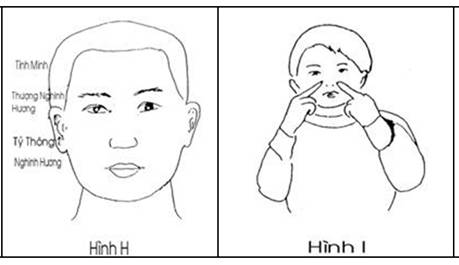 Trước hết chúng ta dùng hai ngón tay giữa cọ xát lại với nhau đến khi nóng lên, rồi đặt hai ngón tay này lên hai bên mũi xoa lên xoa xuống. Xoa lên đến điểm cao nhất là huyệt Tình Minh và thấp nhất là huyệt Nghênh Hương (xem hình I). Cử động từ 21 đến 36 lần. Mỗi lần cử động là kể luôn hai động tác xoa lên và xoa xuống.