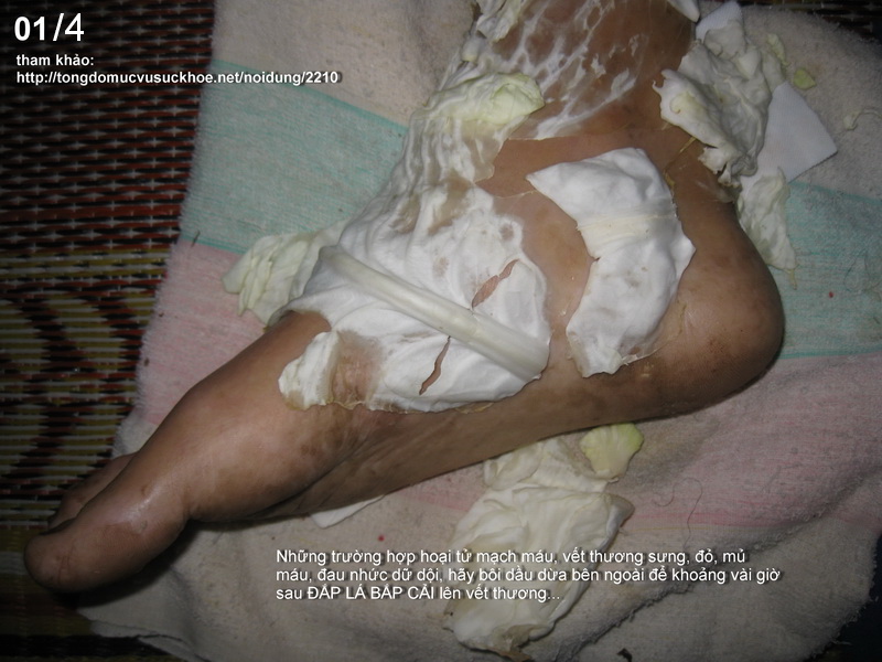 In 1875 a 75 year old man suffered arteriosclerotic gangrene of the lower right leg and foot. The skin was black and the front of the lower leg was decayed. Following the local application of cabbage leaf dressings, the skin changed from black to brown to red, and then returned to its normal healthy color. Three weeks later, writes doctor Blanc, there was a considerable improvement.