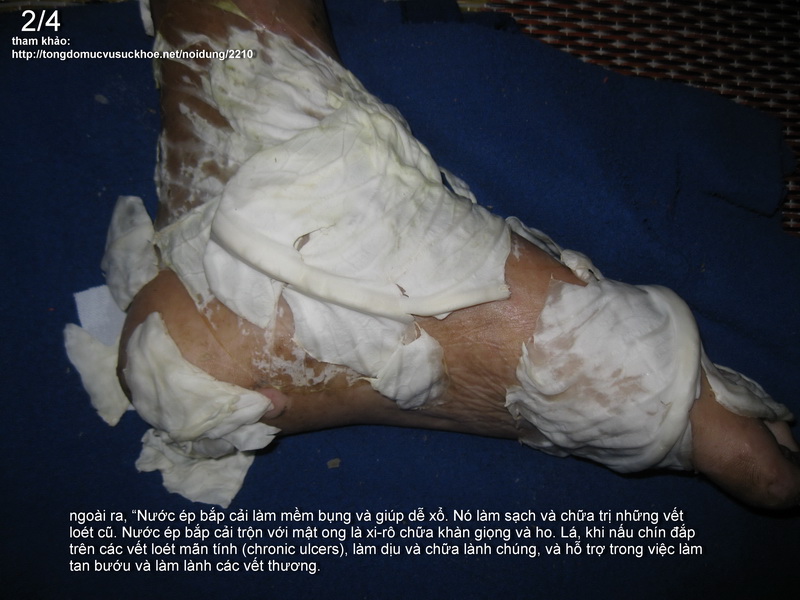 Nếu muốn đắp lên vết loét hay vết thương nhạy cảm: dùng cái chày hay chai nước lăn tròn trên lá cho lá dập ra, nước bắp cải sẽ chảy ra trên mặt, sẵn sàng để đắp. Một, hai hay ba lần đắp tùy theo tình trạng vết thương. Lấy miếng vải dầy phủ lên trên và tiếp tục việc đắp trong vài gìơ, thường là cả đêm, hay suốt ngày nếu đau nhức làm cho không ngủ được.Nếu vết loét sưng và ngứa, ngâm lá bắp cải trong dầu dừa, (hay dầu oliu, dầu mè) 30 phút. Việc này sẽ làm dịu mô viêm cũng như chống nhiễm trùng và hỗ trợ việc chữa lành. Khi đắp lá bắp cải trên vết thương nhiễm trùng, ung loét, hay nấm eczema rỉ nước nhớ đắp các lớp chồng lên nhau như lợp mái nhà để có chỗ cho máu mủ, chất lỏng chảy ra giữa các lớp. Khi điều trị đau lưng, đau khớp, hoặc các bệnh khác nhau do dây thần kinh hoặc bàng quang, thuốc đắp lá bắp cải giúp thuyên giảm nhanh chóng. Thuốc đắp được chuẩn bị như sau: nấu sôi 20 phút 2-4 lá bắp cải với 2 lát hành tây và 3-4 nắm cám gạo mì với 1 chút nước. Khi nước cạn, cho vào gạc băng và đắp nóng trong 1-2 giờ, hay cả đêm. (Không bao giờ đắp nóng lên vùng bụng đau nhức). Chỉ có bác sĩ mới chần đoán chính xác nguyên nhân của chứng đau bụng này, và đắp nóng lên vùng viêm ruột thừa hay nhiễm trùng buồng trứng có thể có hại). Bác sĩ Garnett-Cheney, giáo sư tại Trường Y khoa Stanford, xuất bản một báo cáo liên quan đến việc sử dụng nước ép bắp cải trong điều trị loét dạ dày. Trong 65 trường hợp được báo cáo, có 62 trường hợp được chữa khỏi vào cuối tuần thứ ba. Bắp cải được dùng để chữa bệnh thiếu máu của động vật thí nghiệm gây ra bởi một chế độ ăn uống chỉ dùng sữa. Trong nghiên cứu tại Đại học Texas. Tiến sĩ W. Shive chiết xuất từ ​​bắp cải một chất mà ông gọi là Glutamine, hữu ích trong việc điều trị chứng nghiện rượu và loét dạ dày. Bắp cải có giá trị vô vàn đối với phụ nữ mang thai, cho bệnh nhân thiếu máu, mệt mỏi, nhiễm trùng, bị ký sinh trùng đường ruột, có sạn, và viêm khớp. Chúng tôi liệt kê một số bệnh mà bắp cải được sử dụng để chữa trị: