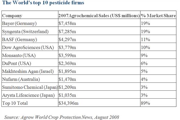 Sau đây là tên tuổi của một số tài phiệt quốc tế về hóa chất nông nghiệp đang ảnh hưởng đến vận mạng của cả thế giới: Dow Chemical, Monsanto và Dupont của Hoa Kỳ, Âu Châu có Bayer và BASF sẽ thay thế Aventis Crop Science, Thụy Sĩ có Syngenta vv…